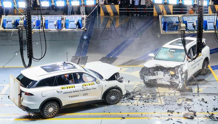 Dalam pengujian tersebut, dua unit Chery Tiggo 9 saling bertabrakan dengan kecepatan 50 km/jam pada sudut 15 derajat small-overlap, sebuah skenario tabrakan yang dikenal sangat menantang bagi struktur kendaraan.