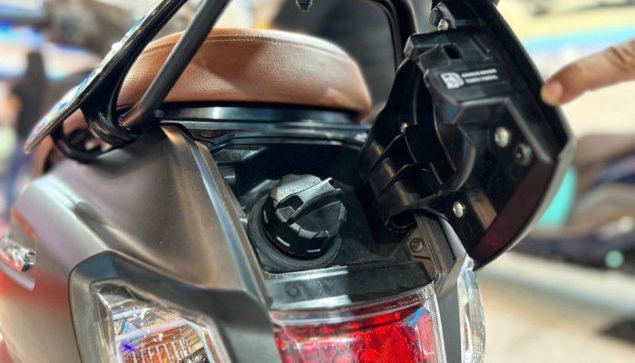 Kedua, penempatan tutup tangki di bagian ekor membuat risiko lantai pijakan (floorboard) atau barang bawaan yang digantung di pengait menjadi kotor saat mengisi bensin dapat dihindari.