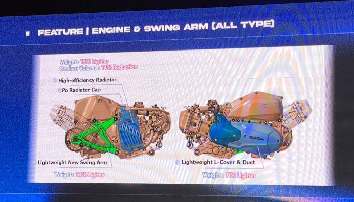 Seperti contoh, pemakaian radiator dan tutup radiator bahan plastik dinilai mengurangi bobot hingga 15 persen, lalu pemakaian swing arm baru mengurangi bobot sampai 10 persen.