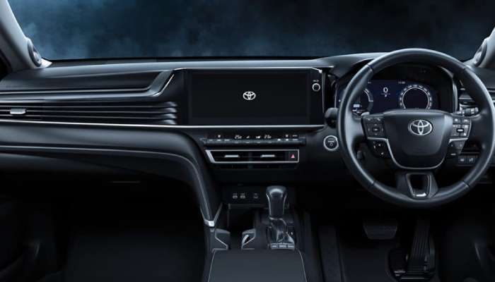 Masuk ke bagian interior, New Camry 2.5 V AT dirancang dengan pendekatan driver-centric cockpit yang mengutamakan kenyamanan dan kemudahan akses bagi pengemudi. Dashboard dengan desain menyerupai gitar elektrik kini dipadukan dengan Combination Meter 12,3 inci Full TFT dan Head Up Display (HUD), yang menampilkan informasi penting, seperti kecepatan serta status fitur Toyota Safety Sense (TSS).
