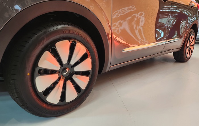 Kemudian pada sektor kaki-kaki mobil tepatnya di bagian pelek mengadopsi single-tone Water Splash Wheel Cap