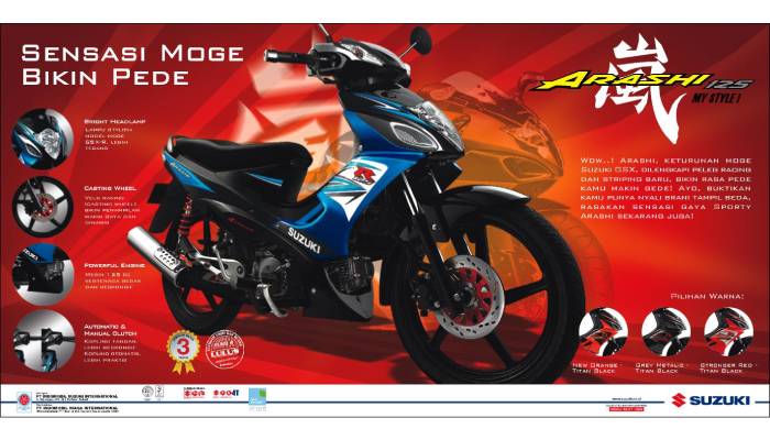Pada awal kehadirannya, Suzuki melabel Arashi 125 dengan fitur modern yang menjadi keunggulan.