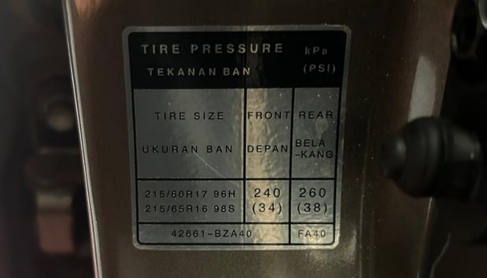 Untuk kepastian, cek stiker rekomendasi tekanan ban dari pabrikan yang biasanya terletak di sisi dalam pintu pengemudi atau dekat tutup tangki BBM.